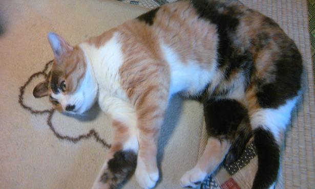 テーブルで新聞を読んでいたら、みっちゃんが側に来てコロンと寝そべりました。