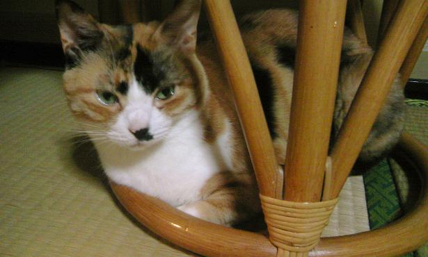 そう「にゃ~ん、にゃ~ん」と文句を言いながら、お気に入りの籐製の椅子の下へ