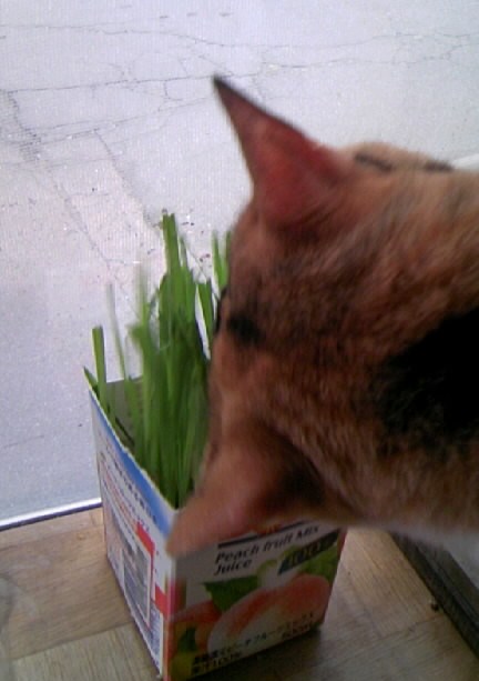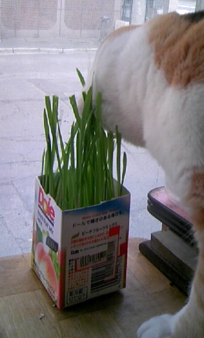 先日ブログUPしてから、更にニョキニョキ伸びた猫草菜園をみっちゃんにお披露目しました。