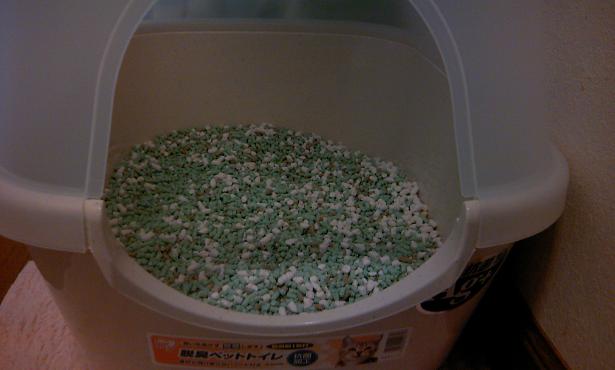 猫砂は、先月末アイリスプラザさんから取り寄せた「お茶の猫砂」