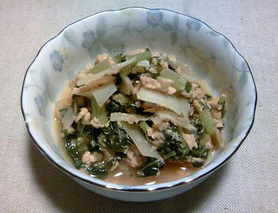 こちらは、大根菜っ葉を茹でて細かく刻み、刻んだ大根の皮と軽くサラダ油で炒ります。
