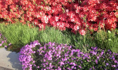 緑の雑草とツツジの赤、芝桜のピンクがとっても綺麗なのです。