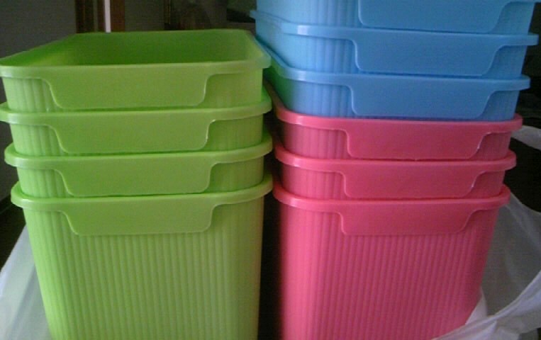 容器は、ダイソーから7ℓのカラフルなゴミ入れを10個買いました。