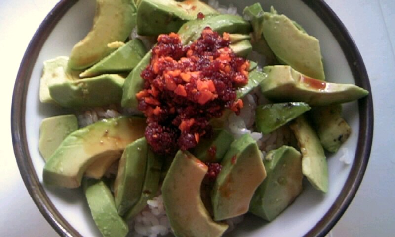 丼にご飯を入れて、皮を向いて一口大に切ったアボガドをのせます。