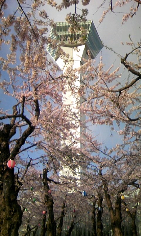 五稜郭タワーを満開の桜の中から